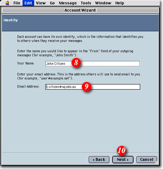 | 8)Type in your name as you would like it to appear in outgoing mail messages |