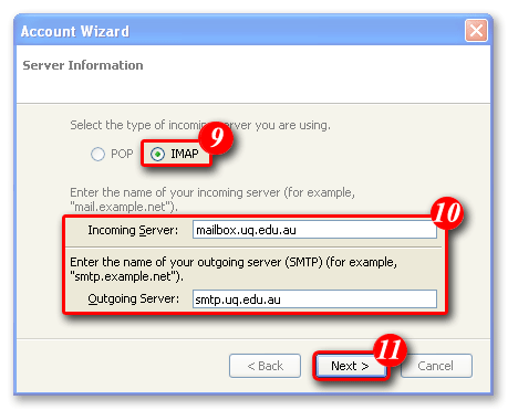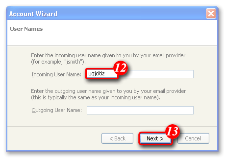 | 10)Enter 'mail.cornjerker.com' in the 'Incoming Server' field, and 'smtp.cornjerker.com' in the 'Outgoing Server' field. |